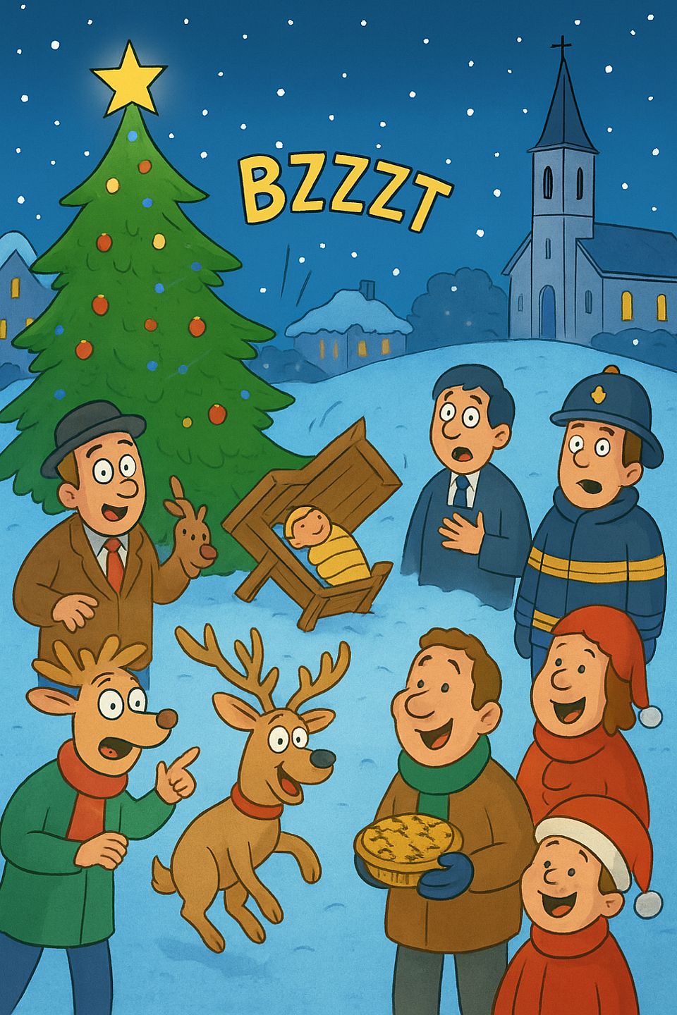 In Lindenbach kündigte sich ein besonders festliches Weihnachten an – zumindest glaubte Bürgermeister Müller das, als er am Weihnachtsmorgen zufrieden vor dem riesigen Tannenbaum auf dem Dorfplatz stand. Der frisch gefallene Schnee glitzerte, als hätte jemand eine Überdosis Glitzerpulver darüber ausgeschüttet.